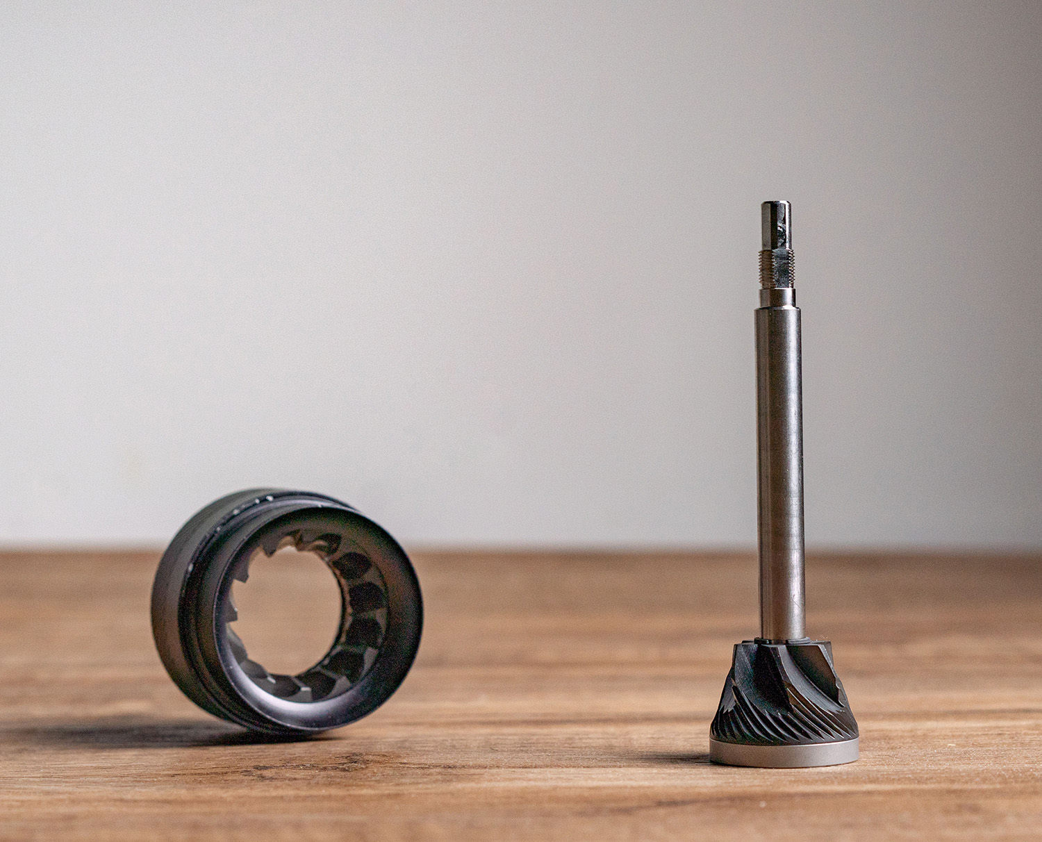 Râșnița 1Zpresso J-max S este echipată cu pietre de măcinare conice de 48 mm. Doi rulmenți asigură măcinare continuă. Mărimea pietrelor de măcinare ajută, de asemenea, la măcinarea rapidă și continuă.