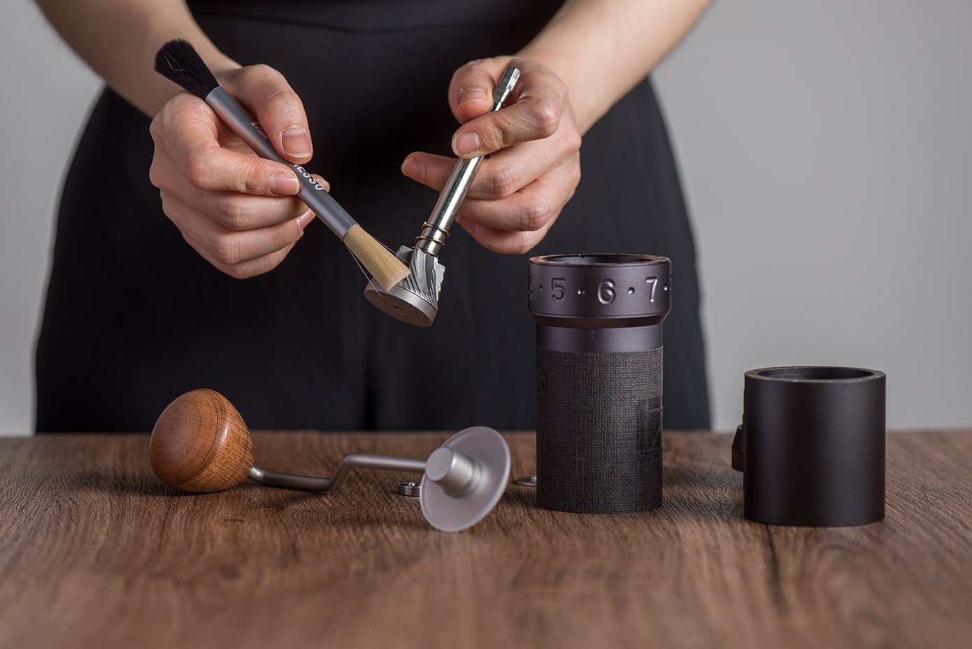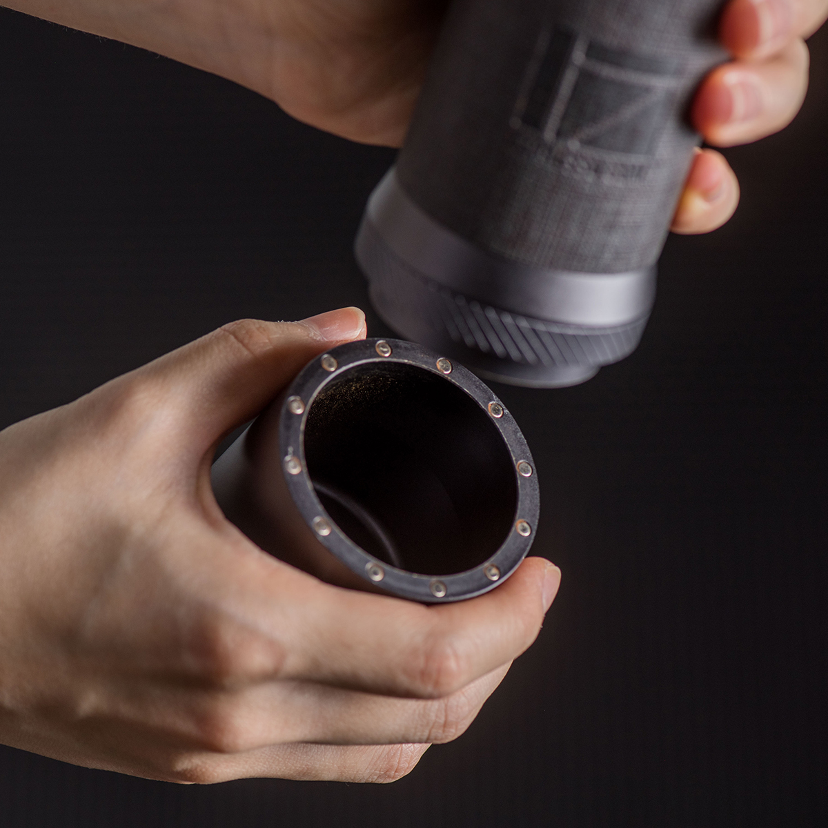 Capacitatea recipientului este de 35-40 de grame, ceea ce reprezintă un volum suficient pentru a măcina mai multe doze de cafea deodată. Recipientul poate fi atașat cu ușurință de pârghia aparatului de cafea cu ajutorul magnetului încorporat. Cafeaua măcinată puteți presa prin orificiul din partea inferioară, potrivită pentru portafiltre cu diametrul de 51 și 58 mm.