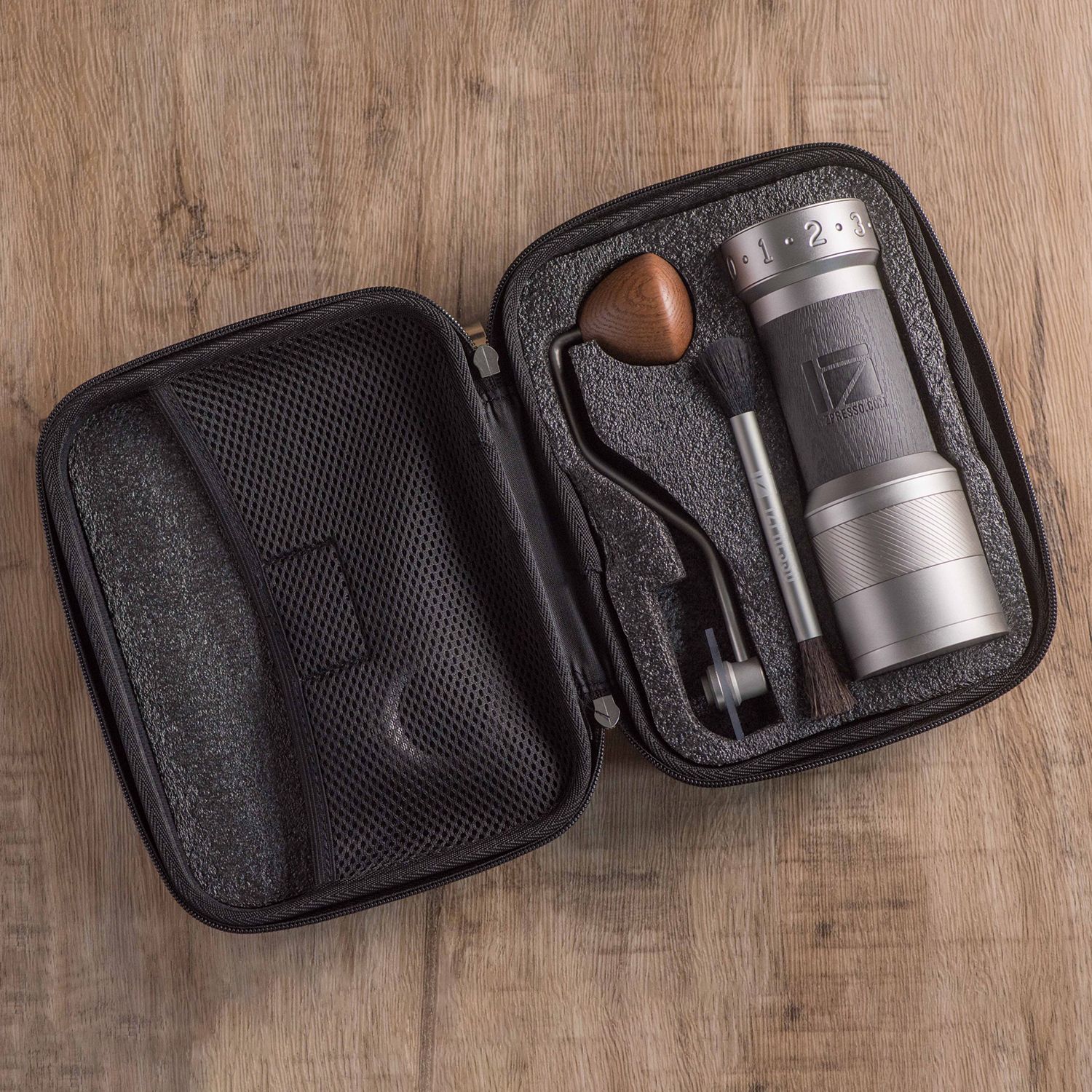 Râșnița 1Zpresso K-plus este realizată numai din materiale rezistente. Corpul este realizat din aliaj de aluminiu cu oțel inoxidabil. Mâner din lemn