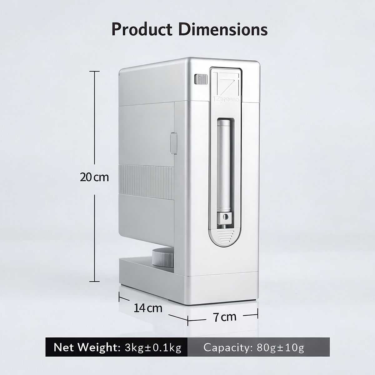 Greutate: 3000g. Dimensiuni: 20 x 14 x 7 cm. Culoare: silver. Capacitate cafea măcinată: 80g. Dezasamblare: magnetică.
