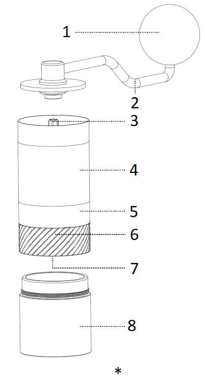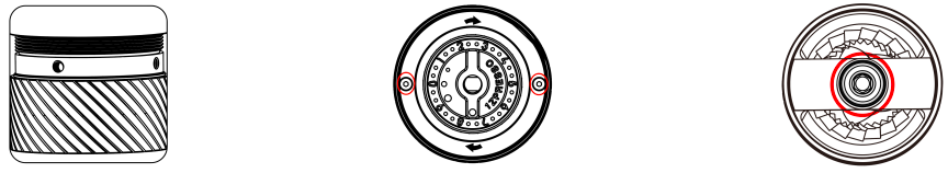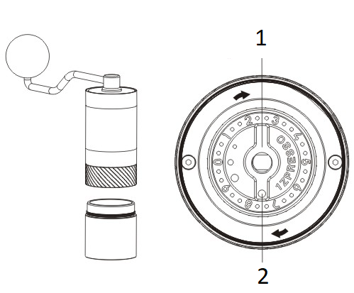 Toate râșnițele 1Zpresso pot fi dezasamblate fără unelte. Instalați și poziționați bine manivela, opriți-o din rotire și slăbiți-o rotiți butonul de reglare în sens invers acelor de ceasornic pentru a-l scoate. |