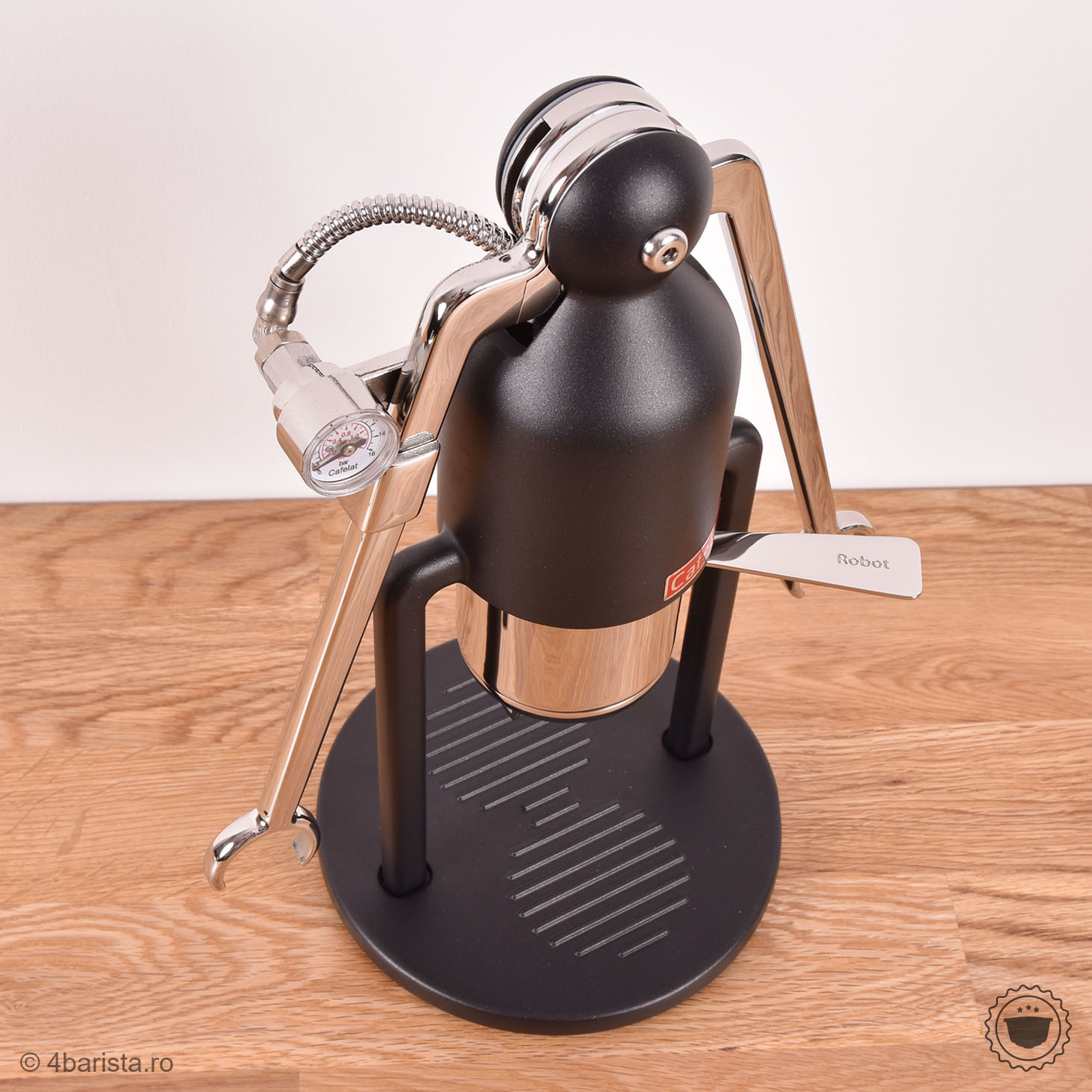 Robotul este un aparat de cafea manual compact, de înaltă calitate, care prepară espresso autentic . Construcția este complet lipsită de plastic și componente electronice - baza este fabricată din oțel inoxidabil, completată doar de elementele necesare din silicon alimentar sigur (garnituri și suport de filtru din oțel inoxidabil).
