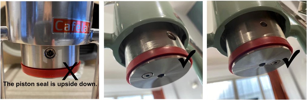 - Garnitura pistonului nu este așezată corect - asigurați-vă că este așezată uniform. Treceți degetul mare și arătătorul peste el de mai multe ori pentru a vă asigura că este așezat corect. Partea plată este orientată în sus, partea cu marginea în formă de V este orientată în jos. Scoateți sigiliul și aplicați unsoarea siliconică (DOW 111) furnizată. Apoi reinstalați sigiliul.