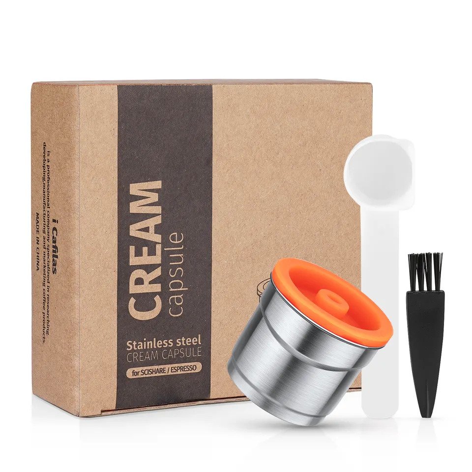 Pachetul include: 1x capsulă din oțel inoxidabil, 2x garnitură de cauciuc de rezervă, 1x lingură de plastic cu fundul plat pentru presarea cafelei în capsulă, 1x perie de curățare. Ambalat într-o cutie reciclată.