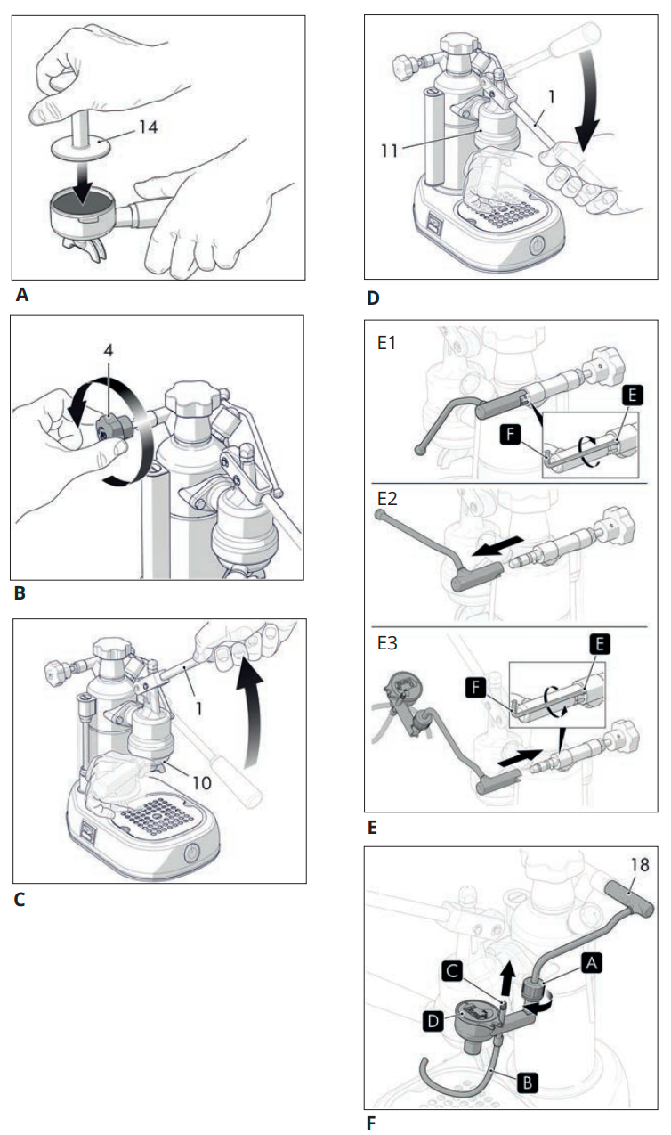 - Scoateți capacul (D), știftul (C) și țeava (B) și spălați-le bine sub jet de apă caldă pentru a elimina reziduurile sau cocoloașele de lapte întărite. Apoi, înlocuiți componentele în ordine inversă.
