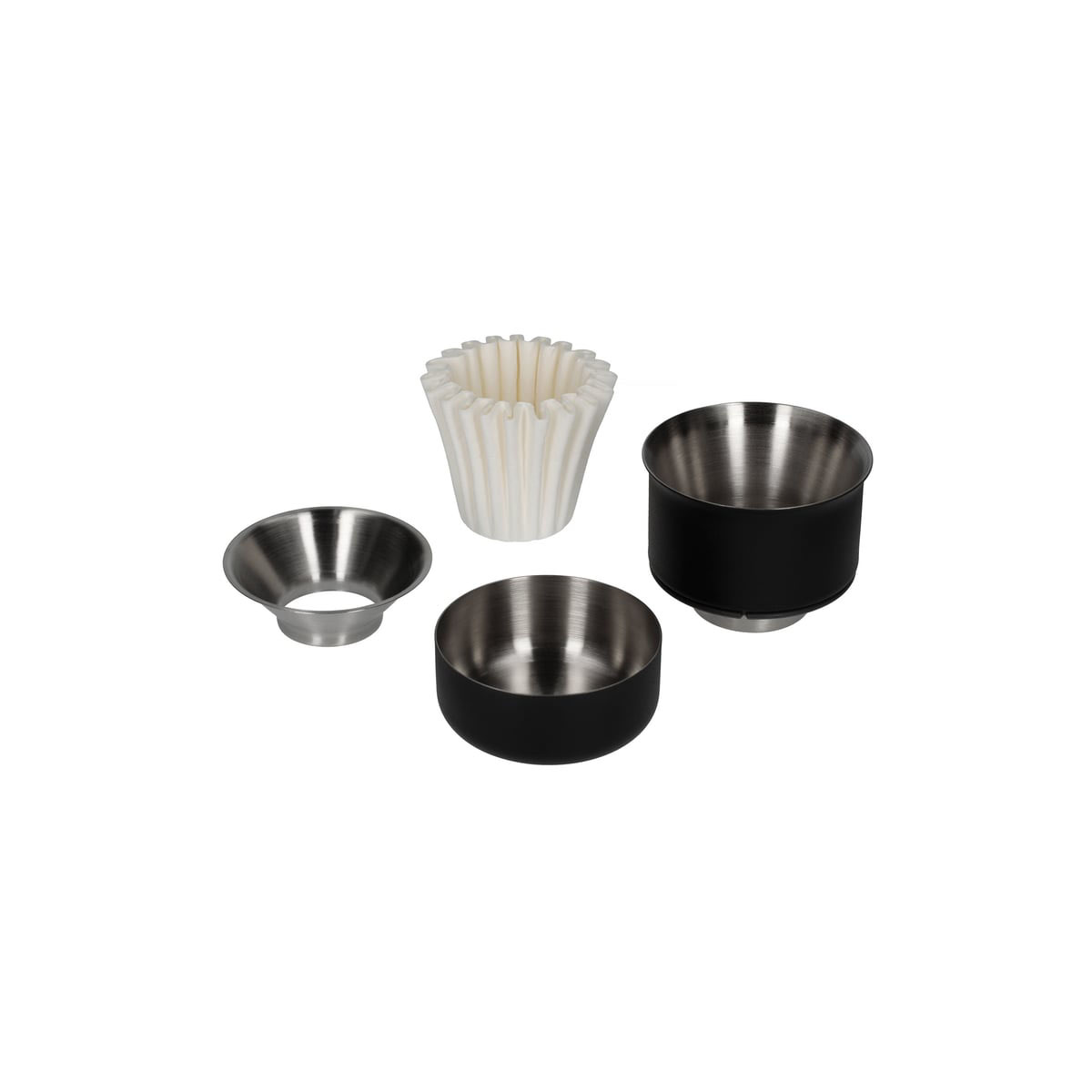 Dripper Fellow Stagg Pour-over este fabricat din oțel inoxidabil, ceea ce ajută la menținerea unei temperaturi constante pe tot parcursul procesului de preparare. Pachetul include, de asemenea, o ceașcă dozatoare de cafea la îndemână, care funcționează ca o tavă pentru picurare.