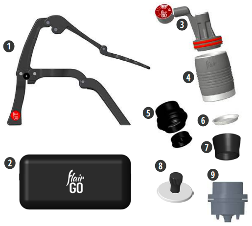 Inclus în toate cele Flair 2GO-uri 1. Corp pliabil Flair 2GO 2. Flair 2GO Geantă de transport 3. Piston cu manometru 4. Cilindru de preparare fără preîncălzire Inclus în modelul Grounds 5. Portafiltru 2 în 1 fără fund 6. Stainless steel dispersion screen ( se găsește în interiorul cilindrului de preparare ) 7. Pâlnie de dozare 8. Flair 2GO Sabotaj Inclus cu modelul Pods 9. Portafiltru pentru capsule |  |