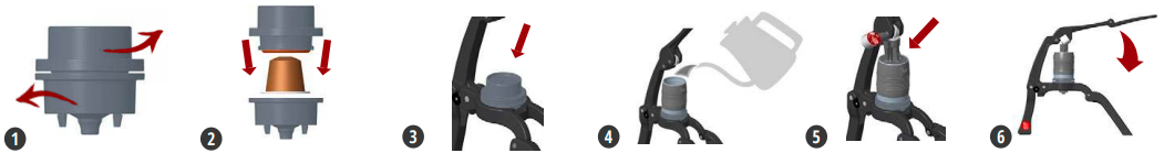 Pod Portafilter - Model de capsule Preparare cu capsule originale Nespresso Nu funcționează cu capsulele Vertuo sau K-Cup! Capsula ta Portafilter are două jumătăți, una superioară și una inferioară, care se rotesc una spre alta. Partea superioară are un compartiment special pentru capsule, iar cea inferioară are o grilă de rupere a foliei. Prepară orice cantitate între 20 și 50 ml, adăugând mai multă sau mai puțină apă până la linia maximă de umplere. |  |