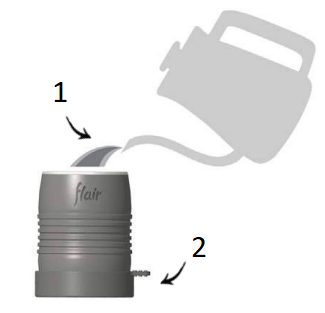 Flair 2GO-ul dvs. nu necesită preîncălzire pentru a se o extracție bună de espresso. Dar, dacă preparați un espresso ușor prăjit sau doriți un shot extra picant, puteți preîncălzi cilindrul. Există două metode pe care le recomandăm. - Așezați cilindrul în poziție verticală într-un bol sau chiuvetă și umpleți-l cu apă fiartă. Lăsați-l să stea 30 de secunde. Scoateți-l cu grijă.