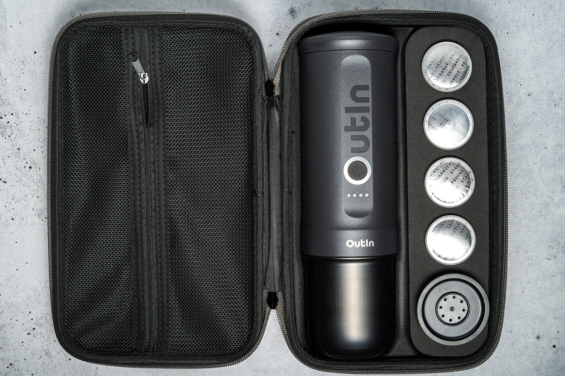 Outin Set Nano (Space Grey) - aparat de cafea de călătorie + husă de protecție