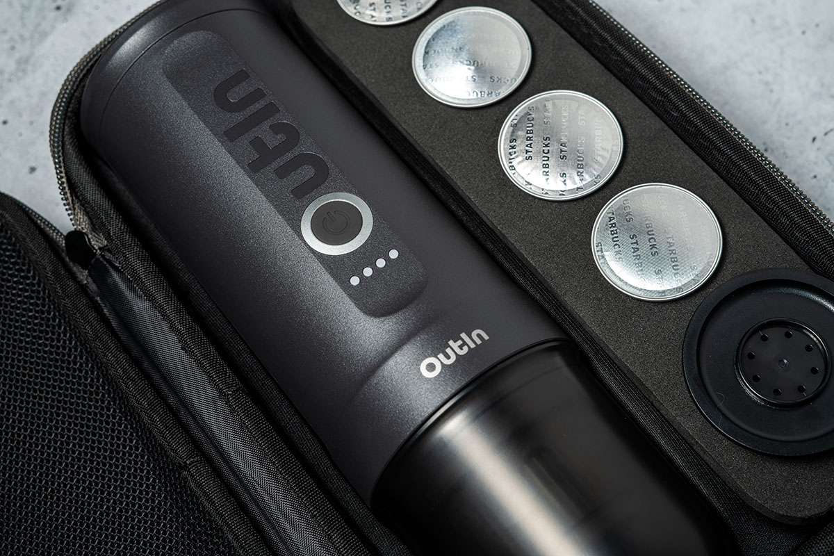 Setul accesibil include aparatul de cafea Outin Nano împreună cu o husă de protecție durabilă, fabricată din material EVA dur. Husa este echipată cu un compartiment integrat practic, care poate depozita până la patru capsule sau un recipient cu cafea măcinată.
