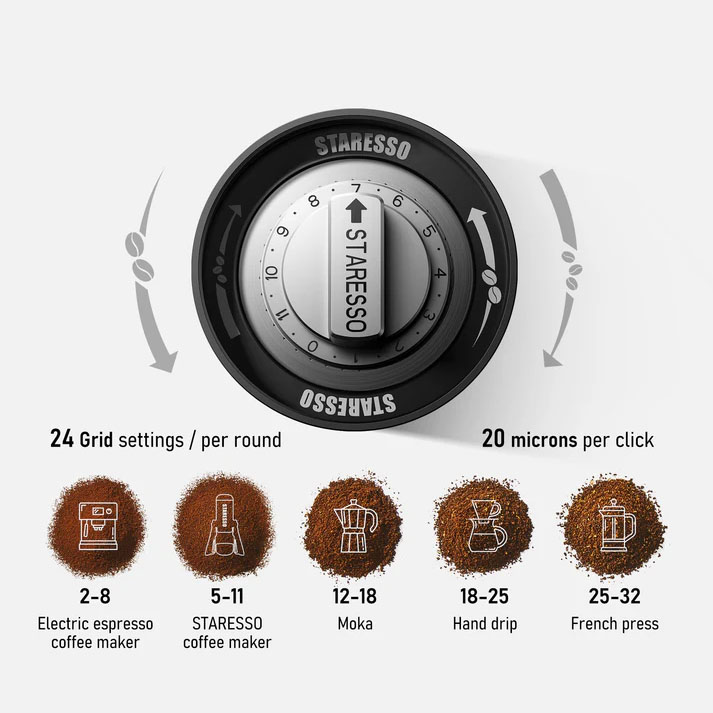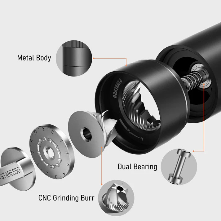 Descoperiți și aparatul electric Staresso Discovery II - D6E PLUS , cu o baterie care poate măcina până la 25 de doze de cafea cu o singură încărcare.