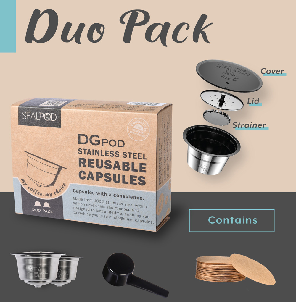 Nou în oferta noastră, 2x capsule reutilizabile din oțel inoxidabil SEALPOD Vă oferă posibilitatea să vă creați propriile capsule de calitate pentru aparatele de cafea de tip Dolce Gusto ® din materiale ecologice. Versiunea actualizată din anul 2023 conține capac din silicon îmbunătățit, cu o compatibilitate și mai bună.