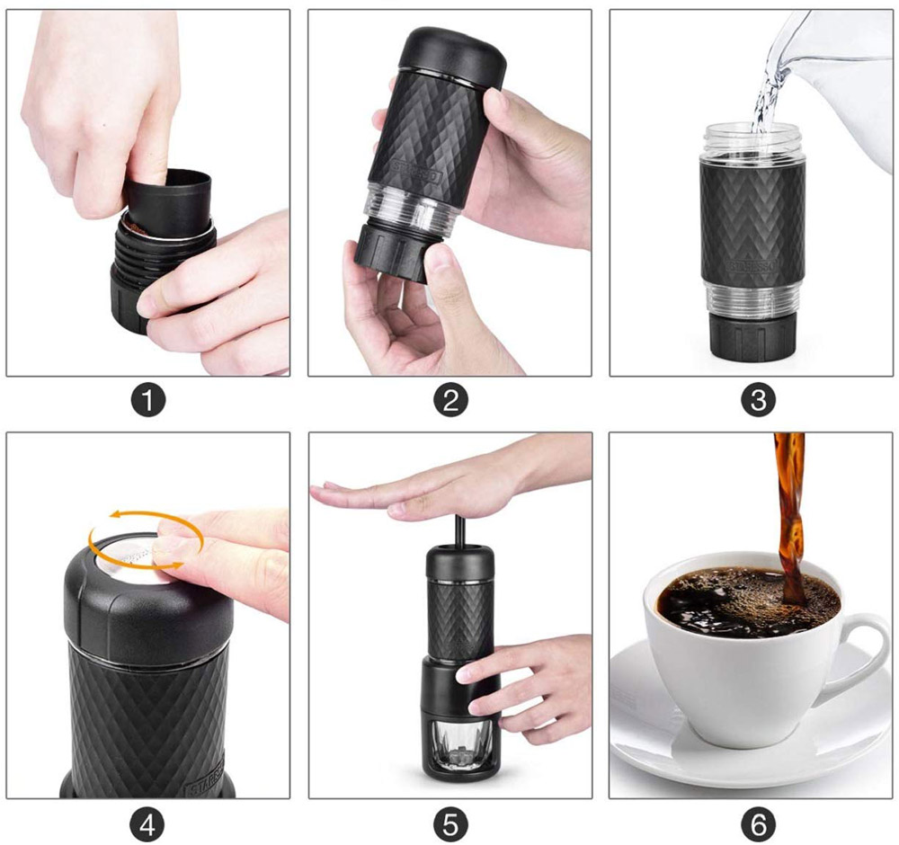 Aparatul de cafea portabil Staresso va prepara un espresso delicios, fără a consuma energie electrică. Prin simplă pompare, atingeți o presiune de15-20 bari, comparabil cu un espressor clasic. Aparatul de cafea Staresso utilizează cafea măcinată, dar și capsule de tip Nespresso. Datorită dimensiunilor sale, este potrivit să fie transportat, dar se poate și utiliza pe loc, ca substitut pentru aparatul de cafea clasic de acasă, la serviciu sau la cabană.