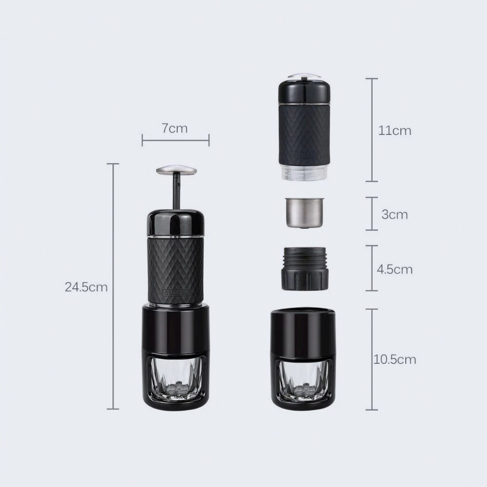Dacă sunteți în căutare de un aparat de cafea de voiaj cu dimensiuni minime, vă recomandăm să alegeți aparatul de cafea Wacaco Nanopresso (336g) sau Wacaco Minipresso (360g).