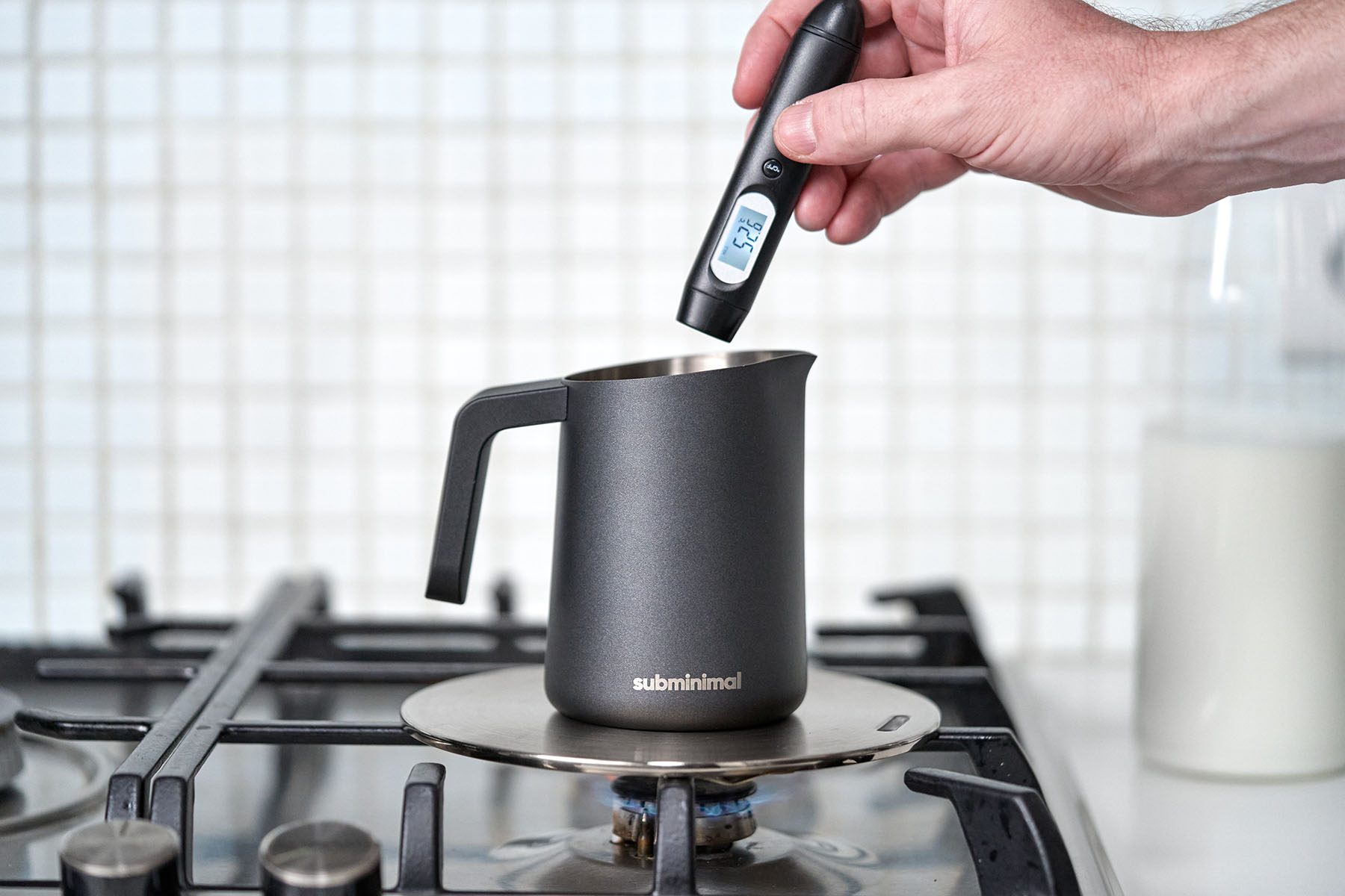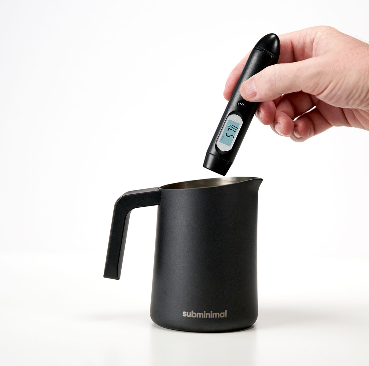 Termometrul digital fără contact este un plus excelent pentru spumatoarele de lapte și ulcioarele de lapte de la Subminimal.