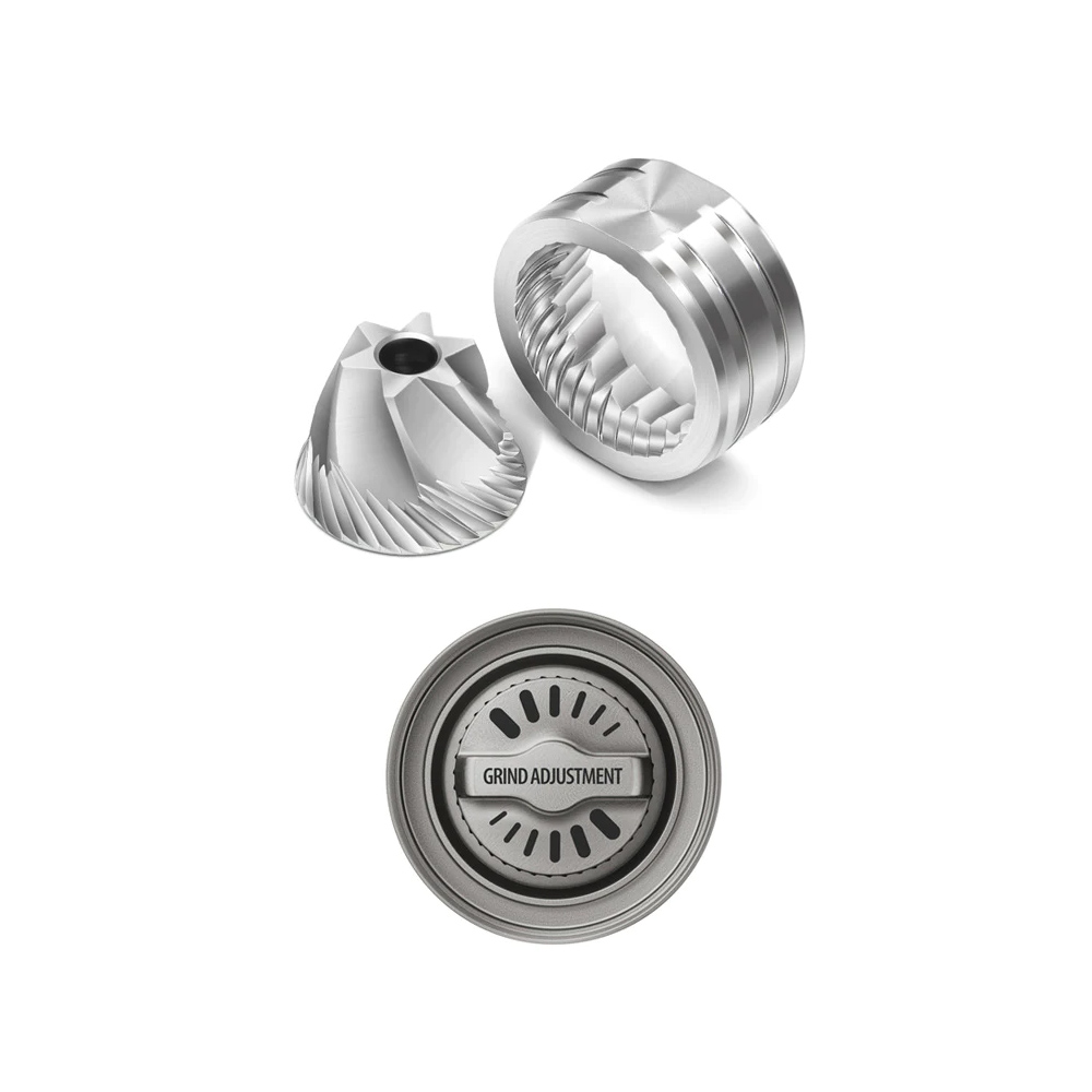 Datorită pietrelor de măcinare din oțel inoxidabil de 38 mm frezate cu precizie și rulmenților încorporați, măcinarea este foarte silențioasă și fină.